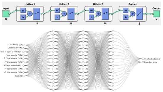 Thus, the extracted sampling data from Monte Carlo simulation consisted of 6000 sandwich structure design points, with associated structure responses in terms of structure deflection and maximum face sheet stress. In general, the architecture of a backpropagation feedforward ANN comprises an input layer for receiving inputs, one or more hidden layers for executing the training process and an output layer for producing predictions. Each layer is fully interconnected with the next layer. In this study, as illustrated in Figure 4, the input layers consisted of 10 neurons representing the input variables (i.e., core density, core thickness, face sheets materials and applied load), whereas three hidden layers were used with 18 neurons each, and the output layer included 2 neurons for the maximum deflection and maximum face sheet stress.