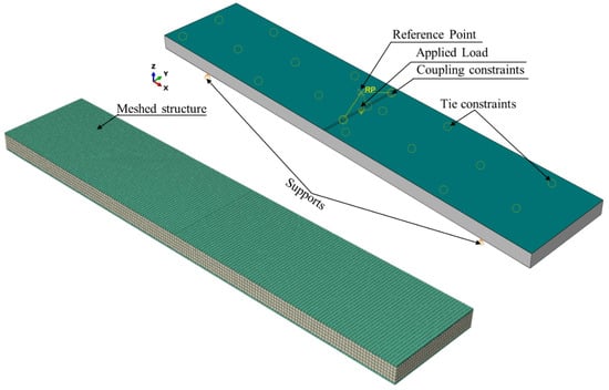 The investigated structure’s supports were modeled to be simple supports, and a reference point (RP) was created for applying the load to the upper face sheet. A tie interaction was specified for the mating surfaces (i.e., face sheets and core), while a kinematic coupling constraint was defined between the reference point and the loading region in the upper face sheet. This constraint couples the motion of the reference point to the motion of the corresponding regions on the structure, which in turn allows the applied load to be effectively transferred from the reference points to the modeled structure. The interaction, loading and boundary conditions are depicted on the right-hand side of Figure 6. To solve the numerical model, the meshing process was conducted with 27,555 elements for the core. The shell mesh was assigned for the face sheets with approximately 8500 elements, as depicted in the meshed structure shown in Figure 6. It is noteworthy that the mid-plane deflection was evaluated as a function of the applied load. Therefore, only the stresses within the elastic portion were considered in these analyses.