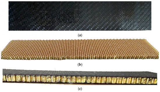 The investigated sandwich structure’s components: (a) face sheet, (b) honeycomb core and (c) assembled final structure.