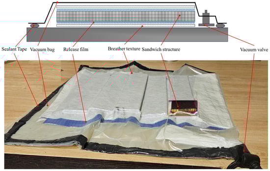 By applying vacuum inside the bag through a vacuum pump, a uniform pressure is induced over the assembled sandwich structure. This helps to remove trapped gases, improve the stacking of the face sheet layers and enhance the adhesion of the face sheets to the core. After confirming there were no leaks in the bag, the assembled sandwich structure was cured in an autoclave.
