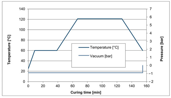 After approximately 70 min of pre-heating, the main curing phase begins, which includes holding the temperature at 123 °C for 60 min. At this point, the resin’s viscosity reaches a minimum as it transforms to a solid phase. Importantly, the vacuum is applied through all curing stages to provide a uniform pressure on the composite structure and remove any generated volatiles. After completing the main curing step, the autoclave is switched off to enable a gradual cooling.