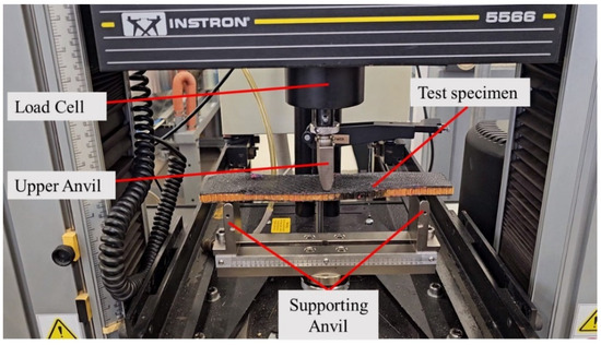 The three-point bending test was carried out using an Instron 5566 (Instron, Canton, MA, USA) universal testing machine, as shown in Figure 10. During the test, the machine crosshead was fixed at a rate of 3 mm/min. Each sandwich specimen was loaded until the maximum load that it could sustain was reached. During the test, the load data and the derived deflections were recorded by the machine’s data acquisition system.