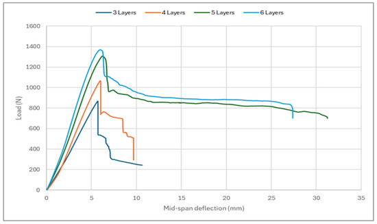 Figure 11 illustrates the load–displacement curves obtained for the respective test specimens. These curves provide an in-depth understanding of the flexural behavior of the investigated sandwich structures. By analyzing these curves, the effect on the overall structural performance of changing the number of layers assigned to the face sheets can be evaluated.