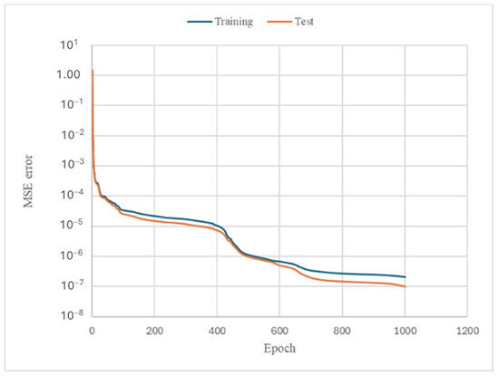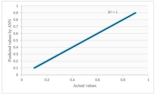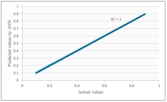 The accuracy of the ANN model’s prediction was evaluated using the mean square error (MSE) (Equation (8)). Additionally, the determination coefficient (R2) was calculated to quantify the accuracy fitness between the ANN model prediction and the actual data (Equation (9)) [46]. Models with a higher R2 (typically R2 > 0.98~0.99) have greater predictive capability, while those with lower MSE values have greater accuracy.