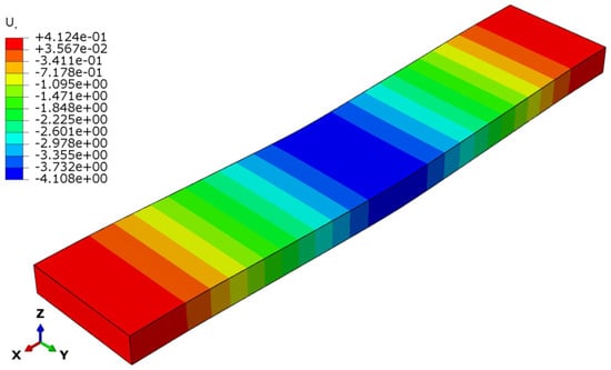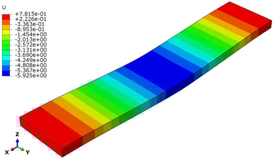 From Figure 15, Figure 16 and Figure 17, Designs 1–3 exhibit a similar deflection mode, which is characterized by global bending; the maximum deflection occurs at the mid-span of the structure. As can be observed in Figure 15, the deformation mode indicates that Design 1—which includes a honeycomb core with a lower thickness and density (tc = 8 mm, ρc = 48 kg/m3)—resulted in higher structural deflection. This behavior reflects a lower flexural modulus from a structural performance perspective. Design 2, the structure with a thicker honeycomb core (tc = 12 mm, ρc = 48 kg/m3), exhibited lower deflection, as shown in Figure 16. This can be attributed to the fact that flexural stiffness is directly proportional to core thickness. Figure 17 illustrates the deflection mode for Design 3 (tc = 8 mm, ρc = 83 kg/m3). It demonstrates that a higher core density increases the structural stiffness, resulting in reduced overall deflection.
