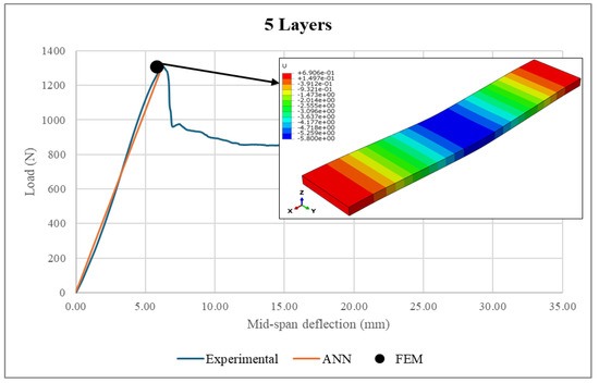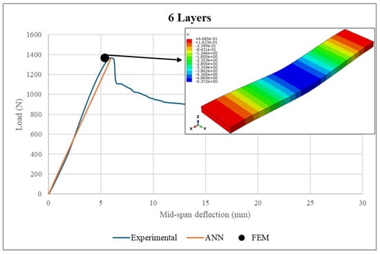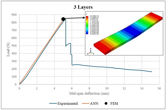 The ANN predictions in terms of maximum structural deflection and maximum face sheet stresses were also compared with the experimental measurements and FEM results. For structural deflection, the maximum deviations were approximately 4.16% and 10.5%, respectively. For the face sheets stresses, the ANN predictions showed good alignment with the FEM results, as the maximum difference was 6.21%. This behavior was consistent across all of the considered numbers of layers, underscoring the robustness of the ANN model.