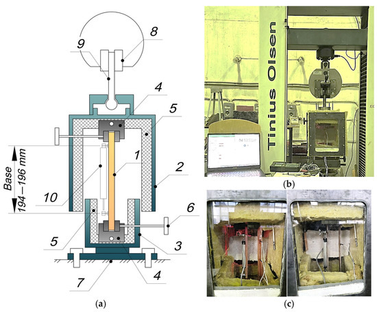 Testing setup: (a) diagram; (b) general view; (c) testing process of polymer (left), glass-reinforced plastic (right): 1—the rod sample, 2—the upper part of the thermal chamber, 3—lower stationary part of the thermal chamber, 4—internal grips, 5—thermal insulation, 6—gripper handle, 7—stationary base of the Tinius testing machine, 8—top gripper of the Tinius testing machine, 9—hinged rod, 10—displacement sensor.