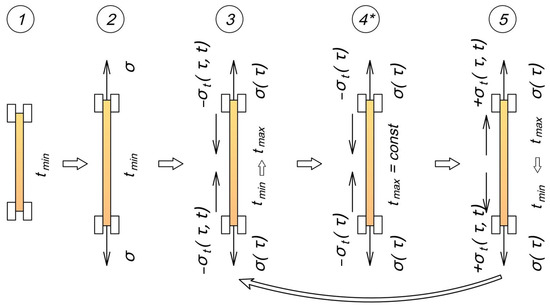 Schematic of experiment stages (numbered) under cyclic thermomechanical loading: 1—initial state at temperature tmin, 2—tensile stresses σ are applied, temperature tmin, 3—temperature increases from tmin to tmax, mechanical tensile stresses σ relax with time τ, compressive thermal stresses σt increase in modulus, 4—stage of holding at constant temperature tmax (*—means that this stage is present only in those experiments where a constant maximum temperature hold is provided), 5—temperature decreases from tmax to tmin, mechanical tensile stresses σ relax with time τ, temperature stresses σt become tensile and increase in modulus. Thin arrows show the direction of stress action (tension or compression), contour arrows indicate transition processes between stages.