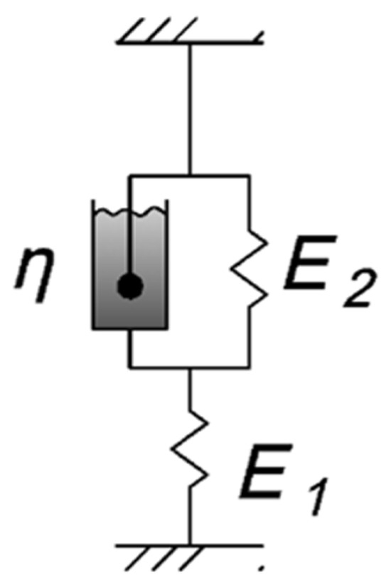 Scheme of the viscoelastic three-element Kelvin–Voigt model. (E1, E2—elastic parameters, η—viscosity).