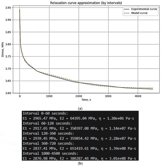 To determine the parameters of the three-element Kelvin–Voigt relaxation model, a Python script was developed to automatically select the E1, E2, and η values that best fit the experimental relaxation curve. The instantaneous elastic modulus, E1, is initially determined using the standard method [59], and its value, along with a tolerance of ±0.5%, is set as a constraint. The primary objective is to accurately approximate the experimental stress–time data. The script utilizes the open-source libraries Pandas, NumPy, SciPy, and Matplotlib.