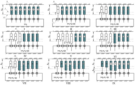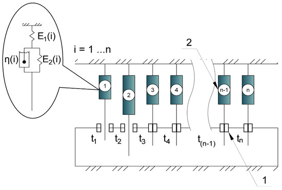 The proposed structural model of the polymer material (Figure 6) is multi-element, consisting of n serially connected elementary cells (2), each (i-th) of which is a Kelvin–Voigt model characterized by parameters E1(i), E2(i), and η(i).