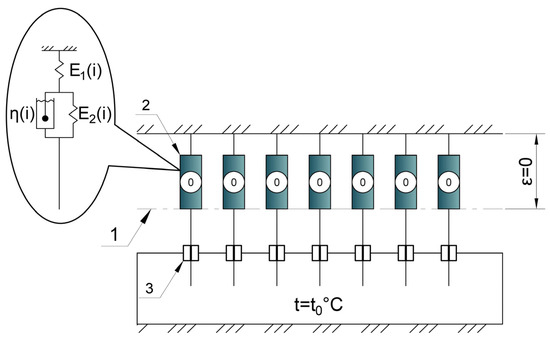 Model scheme: 1—thermal brake; 2—cell in the form of a three-element viscoelastic model.