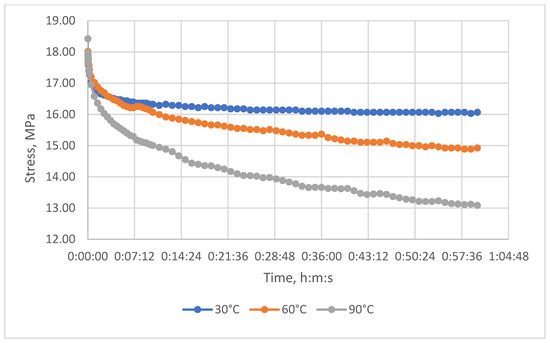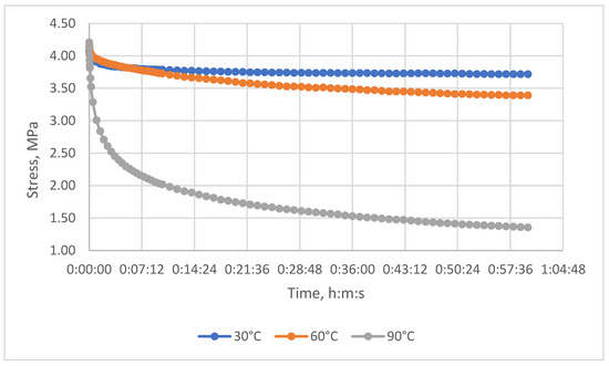 The relaxation curves obtained at 30 °C, 60 °C, and 90 °C, under various initial tensile stresses, for the unreinforced epoxy polymer and GRP are presented in the Results section.
