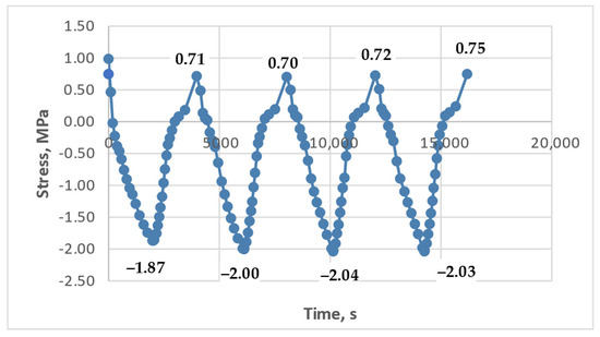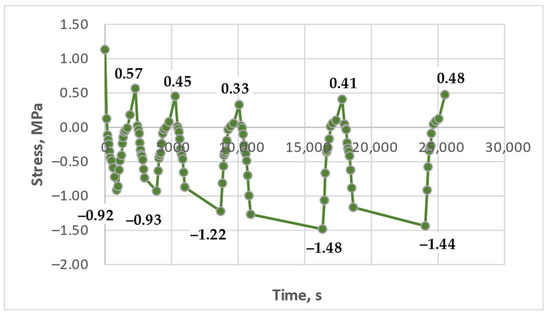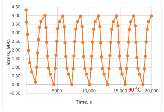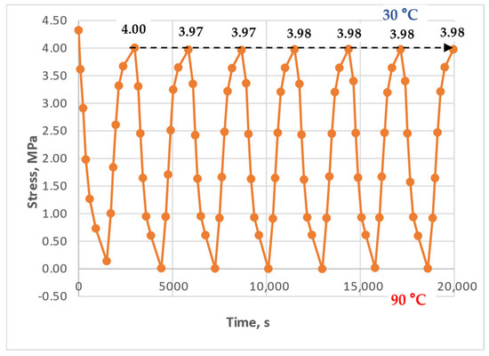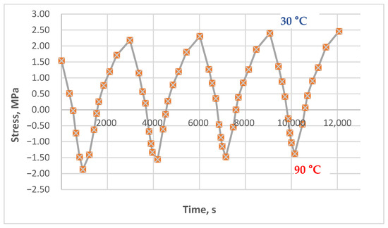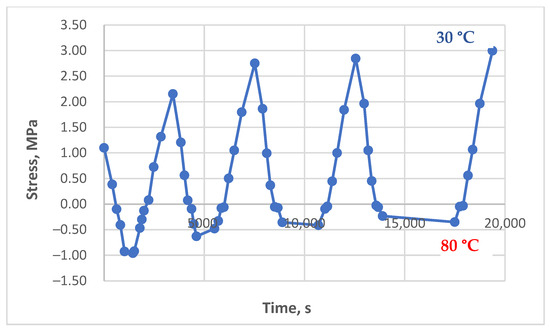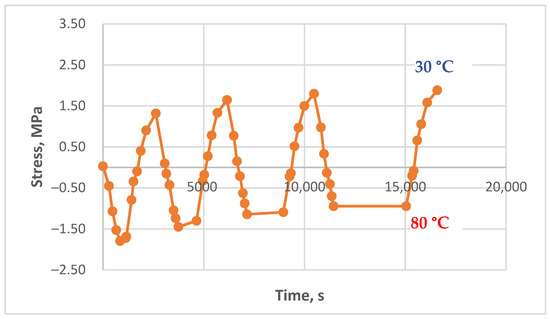 During cooling, the sample contracted, generating tensile stresses, including, as shown in the results, accumulating residual stresses. The heating and cooling cycles were repeated the required number of times, with the force readings from the testing machine’s load cell recorded and subsequently converted to stress values. Based on the experimental data, stress–time curves were generated, and temperatures at control points were recorded at 10 °C intervals. The cyclic thermomechanical loading procedure is illustrated in Figure 3.