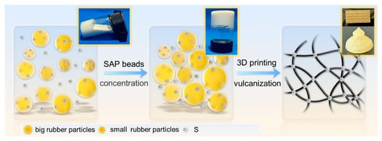 Concentrated natural rubber latex (60% in dry rubber content) was obtained from GuangKen Group Company in Guangdong (Yangjiang, China). Zinc oxide (ZnO), sulfur, zinc diethyl dithiocarbamat (ZDC), potassium oleate, sodium fluorosilicate, formaldehyde, antiaging agent-264, diffusible agent-N, casein, and 2-mercaptobenzene were purchased from Shanghai Aladdin Biochemical Technology Co., Ltd. (Shanghai, China). The commercial SAP beads were procured from Dinghao Corporation (Yiwu, China). The extrusion 3D bio-printer EFL-BP-6601 was purchased from Suzhou Yong qinquan Intelligent Equipment Co., Ltd. (Suzhou, China), and all the printed specimens in this article were completed by this equipment.