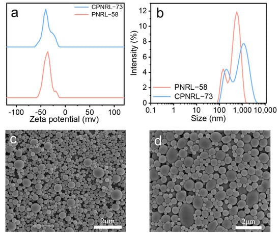 Characterization of the colloidal properties and morphology of PNRL-58% and CPNRL-73%: (a) Zeta potential, (b) particle size, (c,d) SEM images.