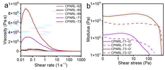 Three-dimensional printed inks, which are typically utilized in DIW printing, should demonstrate suitable rheological properties, including apparent viscosity, yield stress under both shear and compressive forces, and viscoelastic characteristics (i.e., loss and elastic moduli) [36,37,38]. The results of the rheological test of CPNRL are presented in Figure 3a,b. As depicted in the figure, the viscosity of CPNRL is influenced by shear strain, indicating the significance of enhancing the rheological properties of printing ink for improved quality. High viscosity hinders the proper extrusion and shape retention of printed samples after extrusion from the nozzle under external stress. This phenomenon demonstrates the shear thinning behavior characteristic of non-Newtonian fluids, where fluid viscosity decreases with increasing shear stress [39]. Additionally, it is evident that when the solid content reaches 71%, the CPNRL ink exhibits excellent shear thinning ability, initially increasing and then declining. In the shear modulus diagram (Figure 3b), it can also be observed that G′ > G″ for CPNRL with solid contents of 71% and 73% under low shear stress conditions. However, under higher shear forces, G′ < G″ demonstrates remarkable performance in terms of shear thinning behavior. Consequently, we conclude that CPNRL ink with a solid content of 73% or higher possesses favorable characteristics for 3D printing applications, aligning well with the rheological properties of inks required by DIW 3D printing.
