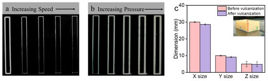 Characterization of the printing line drawings and accuracy of the CPNRL-73 ink. (a) At a constant pressure of 45 kPa across various speeds. (b) At a constant speed of 1000 mm/s under different pressures. (c) The dimension of the accuracy of the cubic sample in the XYZ direction after vulcanization.