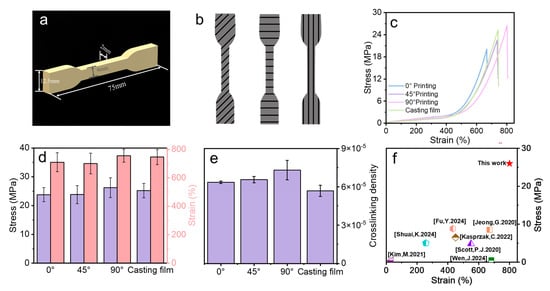 Mechanical testing and characterization. (a) Drawing and dimensions of CAD-generated dog bone. (b) Diagrams of the models for the tensile test prepared in various printing orientations. (c) Stress–strain curves for specimens printed in different directions. (d) Comparison diagram of stress–strain. (e) Cross-linking density of specimens printed in different directions and prepared using the casting method. (f) A comparative analysis of the mechanical properties of various 3D-printed elastomers [1,24,25,26,27,28,42].