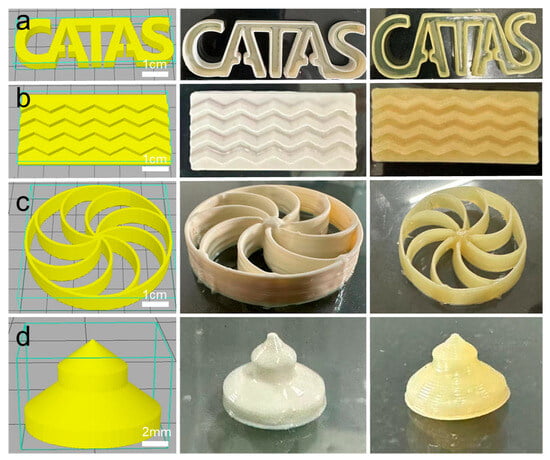 Four distinct structural models were designed using CAD software and printed with the CPNRL-73 ink: a letter model, a tire tread model, rotary-shaped components, and an air rubber bag. In Figure 7, the computer-generated model, the un-vulcanized rubber specimens, and the vulcanized rubber specimens are displayed from left to right. The un-vulcanized printed specimens appear white in color because of the presence of water in the CPNRL-73 ink, and they become light yellow after vulcanization and drying by heating. The surface of the 3D-printed tire tread model was printed according to a 100% infill density, indicating that the ink was smoothly squeezed out during accumulation without any residual ink around the nozzle. The remaining 3D-printed models were stacked by rubber lines, and no collapse or inclination was observed, proving that the CPNRL-73 ink has good support and stability. Following vulcanization, the product exhibits enhanced precision with a reduced rate of shrinkage and deformation. The printed rubber product retains a shape nearly identical to the original design model.