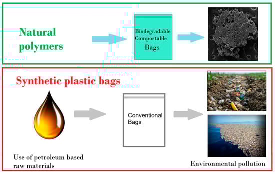 Another major environmental impact related to conventional plastic bags is the utilization of fossil fuels to synthesize the polymer (Figure 1). Synthetic polymer manufacturing from fossil fuels is responsible for atmospheric, water, and soil pollution. The direct consequence of atmospheric pollution is climate change, while water and soil pollution affect biodiversity [,,]. However, because the synthesis of bioplastics is under development, large quantities of plastic materials are still produced from petroleum [,]. Bioplastic materials are classified by their raw source and biodegradability into (i) natural raw materials and biodegradable, (ii) natural raw materials but non-biodegradable, and (iii) synthetic raw materials (e.g., polymers from petroleum) and biodegradable [].