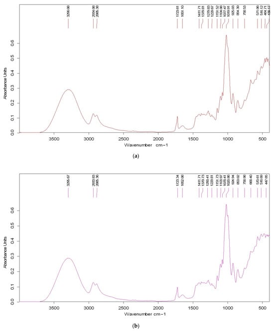 FTIR spectra of thermoplastic materials are given in Figure 3. For sample 1 (Figure 3a), the characteristic bands of starch are identified from 3200 to 3600 cm−1 (vibration that corresponds to O–H stretching) and from 1000 to 1150 cm−1 (attributed to C–O–C and C–O vibrations). PLA characteristic reduced peaks are identified in the interval 1740–1760 cm−1 (C=O in esters), while the presence of bands in the 2800–3000 cm−1 area is attributed to aliphatic C–H vibrations; the reduced intensity of the peaks is due to the small amount of PLA in the sample [,]. The presence of talcum is indicated by the characteristic Si–O vibrations around 960–1050 cm−1 []. Glycerol has a moderate contribution in the 3200–3400 cm−1 region (O–H stretching) and signals assigned to the C–O bond around 1030 cm−1. The spectrum of sample 2 reflects also the predominant contributions of starch and glycerol in this composition (Figure 3b). Talcum contributes modestly, highlighted in the region below 600 cm−1. The characteristic C-O and Si-O bands (960–1150 cm−1 area) are influenced by the presence of starch (the intense signal at 1000 cm−1 has been associated with bending vibrations of C–O–H glycosidic bonds) [].