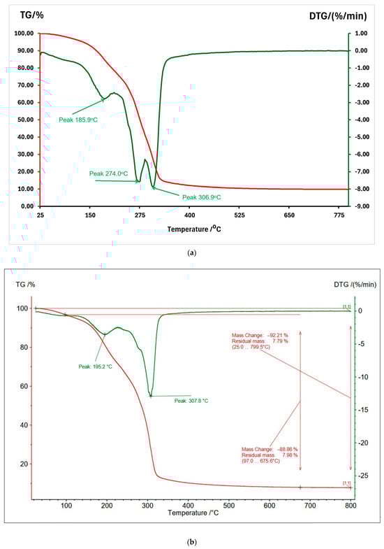Sample 2 (Figure 5b), which contains more PLA, shows better thermal stability, with decomposition starting at higher temperatures (~195.2 °C) []. The main mass loss occurs between 200 and 350 °C, with a peak temperature of 307.8 °C. Starch decomposition starts around 280–300 °C and is characterized by the breaking of glycosidic bonds and transformation into carbonaceous residues. PLA has a main thermal decomposition around 300 °C, which is confirmed by the DTG peak observed at 307.8 °C []. The interaction between residual glycerol and starch/PLA, may contribute also to mass loss at this stage.