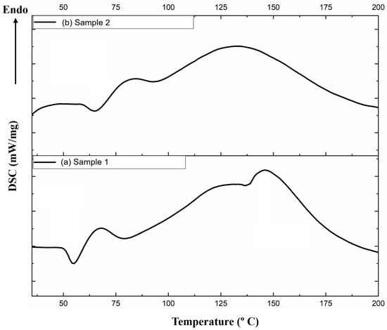 Sample 1 has an exothermic point at a temperature range between 51 and 52 °C (Figure 6a) while sample 2 at a temperature between 64 and 66 °C (Figure 6b). This corresponds to the loss of water [] but at a higher temperature compared to sample 1. The temperature difference suggests a more compact structure for sample 2 given by the higher PLA content, which retains water up to higher temperatures. The following points defined for the thermal transitions of the samples are named To (onset), Tp (peak), and Tm (melting). Sample 1 has an endothermic peak at a temperature range between T0 = 51 °C and Tm = 75 °C, with Tp = 67 °C (Figure 6a) while sample 2 at a temperature between T0 = 64 °C and Tm = 88 °C, with Tp = 79 °C (Figure 6b), which corresponds to the loss of water. The water loss peak and melting peak are shifted toward higher temperatures for the sample with a higher content of PLA.