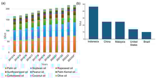 Globally, palm and soybean oils dominate the market with shares of 40.0% and 29.0%, respectively, while other vegetable oils are produced in smaller quantities, and include sunflower (9.7%), rape (6.3%), peanut (4.1%), corn (2.1%), coconut (1.9%), olive (1.8%), and sesame oil (1.1%) [2] (Figure 1a). Asia satisfies over 54.0% of worldwide vegetable oil demand; in particular, Indonesia is the world’s greatest producer, followed by China, Malaysia, the USA, and Brazil (Figure 1b) [3,4,5,6,7,8,9]. Although biodiesel may be considered an attractive alternative for the partial substitution of fossil-based fuels, edible oils are an essential source of nutrition, accounting for approximately 10.0% of the global average caloric food supply, second in importance only to cereals [10].