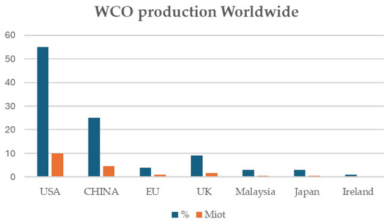 In the USA, according to the Environmental Protection Agency, nearly 11.4 Miot of WCOs are collected from restaurants yearly, only small percentages of which are adequately managed [70], while production estimates are of about 15.0 Miot of WCOs [71]. Even the virtuous EU has a long way to go, considering that according to estimations, the pro-capita production of WCOs in the EU is 8L/year, which, considering a population of around 500 million people, corresponds to a yearly production of WCOs of 4.0 Miot. This value, which is four times higher than the currently collected amount, clearly evidences the gap between WCO production and collection [44]. Another way to estimate the annual production of WCOs in the EU is by considering the region’s yearly consumption of vegetable oils, which amounts to 24.0 million tons (Miot). With 32% of this consumption being discarded, the annual production of WCOs in the EU could potentially reach around 7.7 million tons [18]. This also accounts for the great difference between vegetable oil consumption (220.0 Miot) and the amount of WCOs collected worldwide (about 15.0–18.0 Miot) [71], distributed geographically as reported in Figure 2.