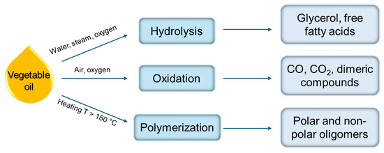 WCOs are mostly produced from food frying at temperatures between 150 °C and 200 °C, and cannot be reused for food processing [55,105,106]. In fact, during use, vegetable oils undergo three main chemical reactions, i.e., hydrolysis, oxidation, and polymerization, which alter their physical chemical characteristics [3,48,104] (Figure 3). Hydrolysis occurs in the presence of moisture in food, resulting in the formation of glycerol and free fatty acids (FFAs), which cause color changes and the production of smoke. Oxidation reactions naturally occur when the double bonds in vegetable oil interact with atmospheric oxygen, leading to the formation of highly reactive hydroperoxides. Additionally, polymerization reactions take place between unsaturated fatty acyl groups, forming dimeric or oligomeric triacyl glycerides [48,55]. Additionally, thermal cracking of unsaturated fatty acids, followed by oxidation at high temperatures, may also promote polymerization reactions, forming a variety of toxic compounds such as heterocyclics [107].