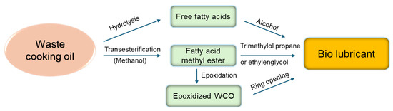Bio lubricants (BLs) are anti-friction agents with improved viscosity, higher thermal tolerance, and lower volatility compared to petroleum-based lubricants. The BL world market had a value of 2 Mio$ in 2022 and is projected to reach a value of 2.8 Mio$ by 2031, registering a CAGR of 3.8% during the forecast period of 2023–2031 [125]. WCOs are an efficient and environmentally sustainable feedstock for BLs due to their high lubricity, high biodegradability, low volatility, and low cost. Different modification routes have been reported for the conversion of WCOs into BLs, such as hydrolysis, esterification, transesterification, hydrogenation, and epoxidation, using both chemical and enzymatic catalyzed reactions [114,126,127,128,129,130], as summarized in Figure 4.