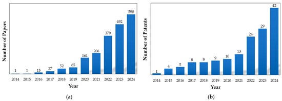 Number of published (a) papers and cumulative (b) patents from 2014 to 2024, identified through Google Scholar using the search term ‘Epoxy Vitrimers’ in the article title.