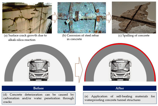 In civil engineering, materials must show outstanding durability, cost-efficiency, and environmental sustainability [20,21,22,23]. These qualities are critical for promoting sustainable construction, reducing energy consumption and CO2 emissions, and ensuring long-term structural performance throughout a structure’s lifecycle [24]. Traditional thermosets, despite their structural robustness, fall short of modern sustainability goals due to their irreversible and non-recyclable nature [25]. Epoxy-based vitrimers, with their dynamic covalent frameworks, bridge this gap by offering reprocessability and self-healing capabilities [3,5]. These features not only lower the lifecycle costs of infrastructure projects but also reduce environmental impact by minimizing material waste. Recent advancements have highlighted the utility of vitrimers in high-stress applications, such as coatings and adhesives, where their self-healing properties significantly enhance service life and reliability [26,27]. Moreover, their tunable thermal and mechanical properties make them ideal for use in harsh environmental conditions [28]. The advantages of epoxy-based vitrimers extend beyond their material properties. Their development aligns with global efforts to promote a circular economy and reduce plastic waste. By enabling recyclability without compromising structural integrity, these materials address critical environmental challenges [17]. Their compatibility with bio-based feedstocks also opens new opportunities for sustainable manufacturing practices [10,19]. The versatility of these systems—demonstrated through shape-memory effects, stress relaxation properties, and resistance to thermal degradation—positions them as frontrunners in next-generation material solutions [4,29,30,31]. Thus, it can be said that integrating epoxy-based vitrimers into civil infrastructure allows industries to achieve a sustainable balance between performance and environmental responsibility. Figure 2 shows a schematic representation showing the application of self-healing materials to old concrete structures for waterproofing purposes. Figure 2a–c illustrate common forms of deterioration observed in aging concrete structures, including tunnels. In contrast, Figure 2d,e demonstrate the protective effects of self-healing materials in safeguarding tunnel structures against harmful ions and water infiltration.