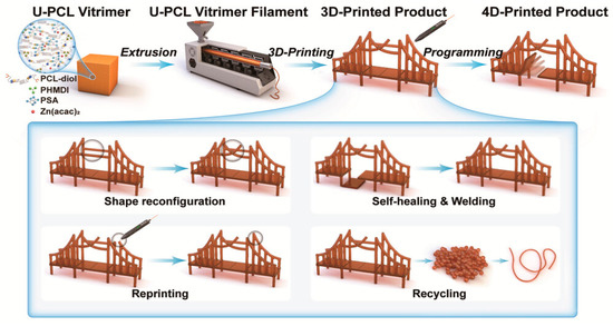 Schematic representation of a 4D printing process of a U-PCL vitrimer via filament extrusion and handheld FDM-based 3D printing, and its multiple functions including shape reconfiguration, self-healing, repair by welding and reprinting, and recycling [64]. Copyright 2021 Wiley.