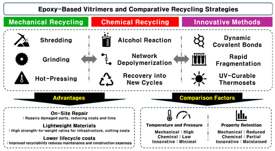 This review systematically examines the dynamic recycling processes, self-healing mechanisms, and emerging applications of epoxy-based vitrimers in civil engineering. Based on a comprehensive analysis and comparison, the following key conclusions are drawn: