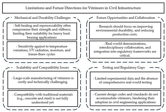 Vitrimers are unique in that they contain dynamic covalent bonds—often enabled by transesterification—capable of breaking and reforming under specific conditions. At elevated temperatures or in the presence of catalysts, these bonds undergo reversible exchange, allowing the polymer network to reorganize without losing its overall integrity. This mechanism underpins the material’s self-healing ability: when damage such as microcracks occur, local heating causes bond exchange, effectively “filling in” the damaged region and restoring structural cohesion. The same principle facilitates recycling, as thermally activated bond rearrangements allow a vitrimer to be softened, reshaped, and remolded multiple times. These repeated reprocessing cycles can be achieved through methods like hot-pressing or extrusion, during which the polymer network becomes sufficiently mobile for reorganization, yet retains solid, robust properties upon cooling. However, their application in civil engineering structures is not without limitations, and considerable future work is needed to enlarge their full potential. One primary limitation lies in the mechanical properties of vitrimers. While their dynamic covalent bonding enables reprocessing and self-healing, these features often come at the expense of strength and stiffness, making them less suitable for heavy load-bearing applications [106,107]. Improving the balance between reprocessability and structural performance remains a challenge. Additionally, thermal and environmental stability pose significant concerns. Vitrimers are sensitive to temperature variations, which could limit their functionality in high-temperature environments or during fire scenarios. Prolonged exposure to environmental factors like UV radiation, moisture, and freeze–thaw cycles further complicates their long-term use. Figure 6 summarizes the limitations and future prospects for the application of vitrimers in civil infrastructure.