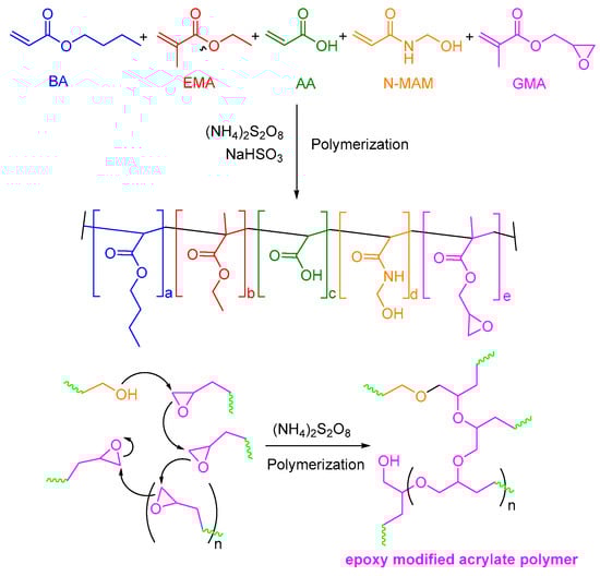 The ethyl methacrylate (EMA, AR), butyl acrylate (BA, AR), acrylic acid (AA, AR), N-hydroxymethyl acrylamide (N-MAM, AR), glycidyl methacrylate (GMA, AR), ammonium persulfate (APS, AR) and sodium bisulfite (SBS, AR) were purchased from Anhui Zesheng Technology Co.(Anqing, China) and polyoxyethylene octylphenol ether-10 (OP-10, AR) was purchased from Beijing Innochem Technology Co. (Beijing, China), Sodium dodecyl sulfate (SDS, AR) was purchased from Shanghai Bidet Pharmaceutical Technology Co. (Shanghai, China), Sodium bicarbonate (NaHCO3, AR) was purchased from Tianjin Beichen Fangzheng Reagent Factory (Tianjin, China). M-xylene (AR) and disodium laureth sulfosuccinate (MES, AR) were purchased from Shanghai MackLin Biochemical Technology Co. (Shanghai, China). All chemical reagents could be used directly in our experiments without any purification.