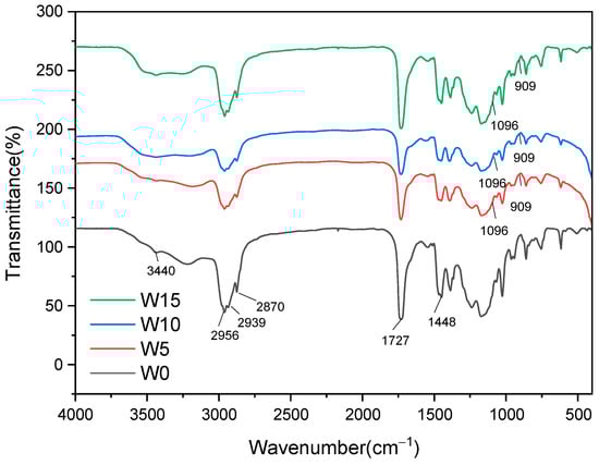 We next sought to verify the successful introduction of GMA in a pure acrylic viscosity reducer. Figure 2 illustrates the FTIR spectra of W0, W5, W10 and W15. In the FTIR spectra of pure acrylic viscosity reducer W0, -CH3 and -CH2- have stretching vibration absorption peaks at 2956 cm−1 and 2870 cm−1, and in the FTIR spectra of pure acrylic viscosizer W0, -CH3 and -CH2- have bending vibration absorption peaks at 1448 cm−1, -NH and -OH have tensile absorption peaks at 3440 cm−1 and C=O have tensile absorption peaks at 1727 cm−1. In the FTIR diagram of GMA (W5, W10, W15), it can be seen that the tensile vibration at 909 cm−1 is the epoxy group, and the absorption peak at 1096 cm−1 is the C-O-C tensile vibration, which may be due to the ring-opening of some epoxy groups, indicating that GMA has successfully introduced the polyacrylate molecular chain. Due to the addition of GMA, which introduces epoxy groups that require more heat to decompose, some of these epoxy groups can react with -OH, enhancing the spatial network structure of the polymer and further improving thermal stability.