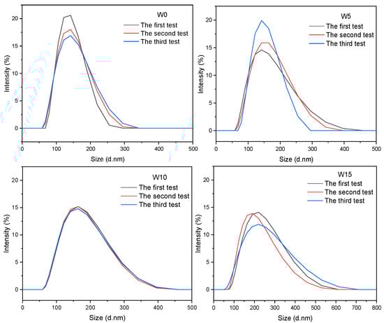 The particle size distribution curves of epoxy acrylate viscosity reducers with GMA contents of 0 wt%, 5 wt%, 10 wt% and 15 wt% are shown in Figure 3. The particle size distribution of the synthesized epoxy acrylate viscosity reducers appears relatively uniform, unimodal and normally distributed, as depicted in the figure. The polydispersity index (PDI) is utilized to characterize the molecular weight distribution of polymers. A higher PDI indicates a broader molecular weight distribution, while a lower PDI signifies a more uniform molecular weight distribution. The particle size distribution was narrow when the GMA content was 0 wt%~10 wt% (50~400 nm, PDI 0.066~0.119), while the particle size distribution was wide when the GMA content was 15 wt% (50~700 nm, PDI 0.173). This finding aligns with the particle size dispersion index presented in Table 2. As this shows, when the addition of GMA was 0% or when it was 5% or 10%, the emulsion particle size of the epoxy acrylate viscosity reducer synthesized by GMA changed little. When the GMA content was 15 wt%, the particle size of the emulsion increased. This was due to the large amount of GMA and the introduction of more acrylate chains and epoxy groups, which enhanced the structure of the polymer. Therefore, the particle size of the W15 viscosifier emulsion was relatively large. The Zeta potential of the synthesized epoxy acrylate viscosity reducer was in the range of ±40~±60 mV, and we found that the viscosity reducer had strong stability and did not easily aggregate. Both the particle size and Zeta potential are important indicators of emulsion stability. Generally, smaller particle sizes correspond to larger absolute Zeta potentials, which indicates a more stable emulsion. An emulsion with an absolute Zeta potential value between 40 and 60 has good stability, making it less likely to experience issues such as precipitation, delamination or condensation. As the amount of GMA increases, the spatial density among the polymers increases, leading to an enhanced polymer structure. This results in a gradual increase in polymer particle size; however, the variation is minimal, and all samples demonstrate good stability.