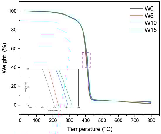 The thermal degradation behavior of W0–W15 under nitrogen at 20–800 °C is shown in Figure 4. All samples exhibited similar degradation behavior. The weight loss at 100–200 °C is due to the removal of unremoved water molecules, while the weight reduction at 350–480 °C is attributed to the decomposition of macromolecular chains. The initial decomposition temperatures were 366 °C, 368 °C, 368 °C and 370 °C, and the final decomposition temperatures were 450 °C, 475 °C, 493 °C and 517 °C, respectively. With the increase in GMA content, the polymer’s thermal decomposition temperature and thermal stability increased in a certain range. Compared with W15, the final thermal degradation temperature of W0 increased from 450 °C to 517 °C. This may be due to the introduction of epoxy groups by adding GMA, which requires more heat to decompose, and some of these epoxy groups can react with -OH, enhancing the spatial network structure of the polymer and further improving thermal stability. Through the test, it can be seen that the thermal stability increases with the increase in GMA content. Among them, W15 has the best thermal stability, which is better than those of the other three polymers. In addition, with the addition of GMA, the thermal degradation of the resin is delayed, as confirmed by the insertion curve in Figure 4. In the specific research range, the delayed thermal degradation showed an increasing trend with the gradual increase in GMA content. The addition of glycidyl methacrylate (GMA) introduces epoxides that require higher temperatures to decompose. Some of these epoxides can react with hydroxyl groups (-OH), which enhances the spatial network structure of the polymer and further improves its thermal stability. When the GMA content reached 15 wt%, the maximum weight loss temperature increased by approximately 12 °C compared to the sample without GMA. Among the synthetic polymers, W15 polymer introduced the most GMA and showed the best thermal stability. Therefore, compared with other synthetic polymers, it has a significant advantage in the viscosity reduction of heavy oil and is an ideal choice.