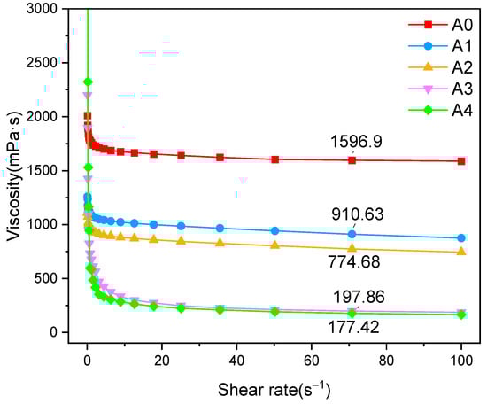 In Figure 5, the viscosity changes of W15 epoxy acrylate viscosity-reducing agent with different concentrations are shown at different shear rates and a test temperature of 50 °C. As can be seen from the figure, with the gradual increase in shear rate, the viscosity of A0–A4 decreases rapidly. According to the literature, the viscosity of heavy oil decreases as the shear rate increases due to reduced entanglement and bonding between the heavy oil molecules or emulsions [30,31,32,33,34,35,36,37,38,39,40]. For instance, the viscosity of A0 is 1596.9 mPa·s at a shear rate of 70 s−1. Additionally, the figure demonstrates that with the addition of a viscosity reducer, the viscosity of heavy oil decreases significantly. For instance, after adding A1 and A2, the viscosity of heavy oil decreases from 1596.9 mPa·s to 910.63 mPa·s and 774.68 mPa·s, respectively. Furthermore, as the viscosity-reducing agent content increases, the viscosity of heavy oil decreases more noticeably. For example, after adding A3, the viscosity of heavy oil decreases to 197.86 mPa·s, and after adding A4, the viscosity decreases to 177.42 mPa·s. According to the viscosity test results in Figure 5, it can be concluded that the addition of W15 viscosity-reducing agent brings about a viscosity-reducing effect. Especially after the addition of 6% or 8% viscosity reduction agent, a significant viscosity reduction effect is produced.