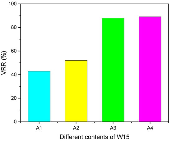 Figure 6 shows the viscosity reduction rate of A0–A4 at a 70 s−1 shear rate. VRR was calculated by the viscosity reduction formula, and η0 was 1596.9 mPa·s. With the increase in W15 viscosity reducer content, the viscosity reduction rate gradually increases. Specifically, the viscosity reduction rate for A1 reaches 43%, while for A2, it is 52%. When 6% and 8% W15 viscosity reducers are added, the viscosity reduction rates for A3 and A4 increase significantly, reaching 88% and 89%, respectively. The effect of adding viscosity reducers on the flow rate of heavy oil is illustrated in Figure 7. When the content of W15 is 2–8%, the viscosity reduction rate can reach 43–89%. The results show that the epoxy acrylate viscosity reducer has a good viscosity reduction effect. When a small amount of m-xylene destroys the structure of heavy oil, the hydrophobic groups in W15 adsorb at the oil–water interface, and the polar groups in W15 increase the polymer’s solubility in heavy oil. In the meantime, the hydroxyl and amide groups in the polymer form strong hydrogen bonds with the asphaltenes in the internal structure of the heavy oil, thus reducing the viscosity of the heavy oil. Combined with the test results of viscosity and viscosity reduction in Figure 5 and Figure 6, it can be seen that the synthesized W15 epoxy acrylate viscosity reduction agent has a satisfactory effect.