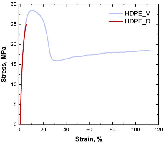 One of the main issues affecting the reutilization of recycled HDPE in the same application as the original material is the dramatic loss of mechanical performance, particularly in terms of ductility, compared to the virgin polymer [14,39]. To verify this feature, tensile and Izod impact tests were carried out on both degraded and virgin HDPE. Figure 1 depicts the stress–strain curves of the two samples, and Table 1 reports the averaged values of the tensile modulus and strength, elongation at break, and impact energy. An overall decrease in all the measured mechanical properties was observed when thermo-mechanical degradation occurred in HDPE. More specifically, while the tensile modulus remained almost unchanged, the elongation at break suffered a substantial reduction of 95%, passing from the virgin material to the degraded one. Likewise, the tensile strength decreased by 12% for HDPE_D. Conversely, the impact energy remained almost unchanged.