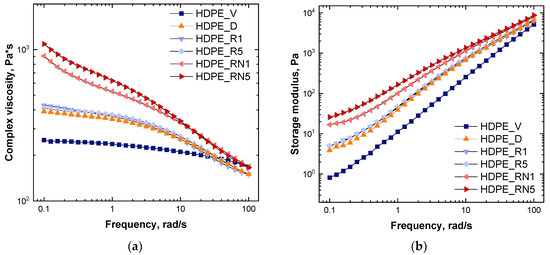 (a) Complex viscosity and (b) storage modulus as a function of the frequency for virgin (HDPE_V), degraded (HDPE_D), and recycled (HDPE_R1; HDPE_R5; HDPE_RN1; and HDPE_RN5) HDPE without and with NEX.