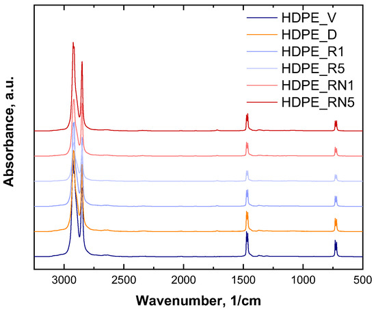 ATR-FTIR spectra for virgin (HDPE_V), degraded (HDPE_D), and recycled (HDPE_R1; HDPE_R5; HDPE_RN1; and HDPE_RN5) HDPE without and with NEX.
