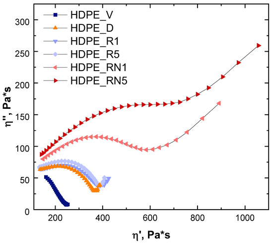 In order to confirm this result, the Cole–Cole plot (displaying the imaginary component of the complex viscosity η″ as a function of the real one η′) was derived, and the obtained curves are reported in Figure 4. Typically, linear polymers show a semi-circular shape, while, for long-chain branched polymers, an upward tail (whose magnitude can qualitatively be related to the degree of long-chain branches) appears [52,53]. As shown in Figure 4, for HDPE_D, HDPE_R1, and HDPE_R5, the behavior expected for linear polymers was obtained, although the degraded and recycled materials exhibited some deviations from the semi-circular shape associable with the inferred heterogeneous microstructure encompassing some branches and crosslinking points. On the other hand, when NEX was added to the degraded HDPE (HDPE_RN1) and, even more, when the material was further processed (HDPE_RN5), a sudden increase in η″ in the high η′ region could be observed, clearly demonstrating the effect of the additive in promoting the formation of LCB, hampering the complete relaxation of the polymer macromolecules (as also demonstrated by the analysis of the relaxation spectra and the Van Gurp–Palmen plots reported in Figures S1 and S2).