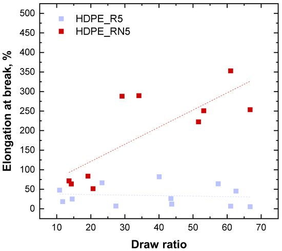 The MS values of recycled HDPE, with and without NEX, were measured, obtaining 2.07 ± 0.27 and 4.32 ± 0.7 cN for HDPE_R5 and HDPE_RN5, respectively. Such result is quite striking and paves the way for the effective exploitation of NEX-containing recycled HDPE for further processing through technologies dominated by elongational flow. To further verify this feature, fibers of recycled HDPE without and with NEX (HDPE_R5 and HDPE_RN5) at different draw ratios were collected, and their tensile behavior was assessed. The obtained results in terms of elongation at break as a function of the draw ratio (DR) are depicted in Figure 5. As far as pristine recycled HDPE (HDPE_R5) was concerned, a slight reduction in the elongation at break with increasing the DR was observed, meaning constant or slightly reduced ductility as the diameter of the fibers decreased. However, higher values of elongation at break were obtained in the oriented samples with respect to their isotropic counterparts (see results reported in Table 1), indicating a beneficial effect of the macromolecules’ orientation. On the other hand, noteworthy results were obtained for the sample containing NEX. In fact, in this case, the fibers showed a significant growth of the elongation at break as a function of the draw ratio. As an example, at a draw ratio equal to 60, a fifty-fold increase in the elongation at break was noticed for HDPE_RN5 with respect to HDPE_R5, reaching a value of 350%.
