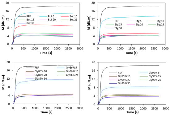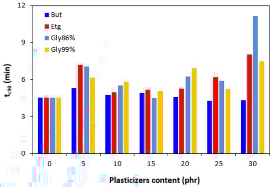 The cross-link density ν is an important structural characteristic that influences the properties of the vulcanized rubber compounds. The cross-linking degree of vulcanizates depending on the type and amount of plasticizer is depicted in Figure 7. It becomes apparent that the application of 1,4-butanediol resulted in the decrease in the cross-linking degree, which is evident mainly at higher amounts of plasticizer. The influence of ethylene glycol and glycerols on the cross-link density was low. It can be stated that the cross-linking degree passed over a slight maximum at 15 and 20 phr of plasticizers and slightly dropped down. The differences in ν became more evident at higher amounts of plasticizers (20–30 phr). In that case, the highest cross-link density was exhibited by the vulcanizates plasticized with glycerol 86%.
