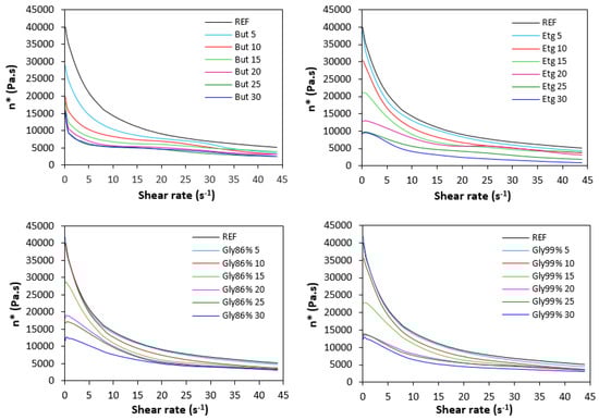 Dynamic complex viscosity η* of the compounds depending on shear rate.